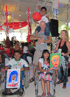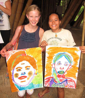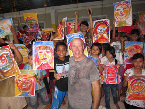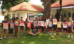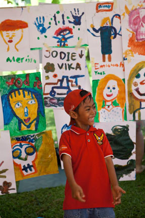 At left two proud children present their individually painted "pieces of the puzzle" that became a large 10x10 foot portrait of Ibu Robin Lim. Amazingly, many of the children who participated in this portrait project were actually birthed by "Mother Robin".